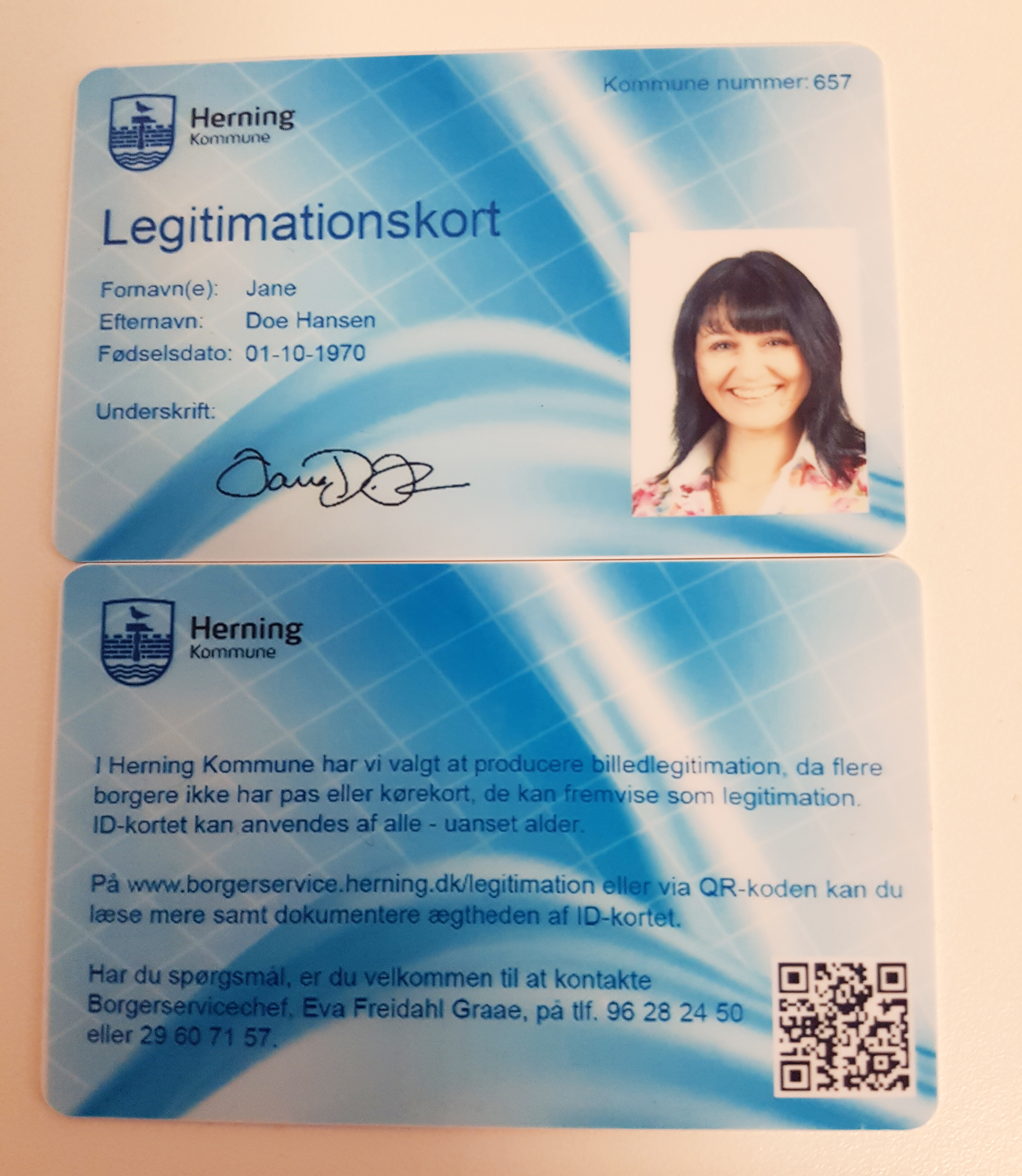 Det blå legitimationskort, udstedt af Herning Kommune, er lige så gyldigt som kort udstedt med det nyere design. Der er ikke udløbsdato på.