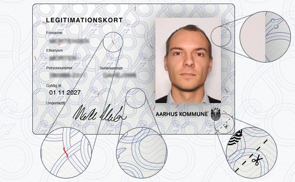 Fotoet er rammet ind i en blød skygge, som får borgeren til at fremstå tydligere. Baggrunden har indlejret små røde nistre, som er unikt placeret på hvert kort. Den udstedende myndighed kan validere placeringen på det pågældende kort.