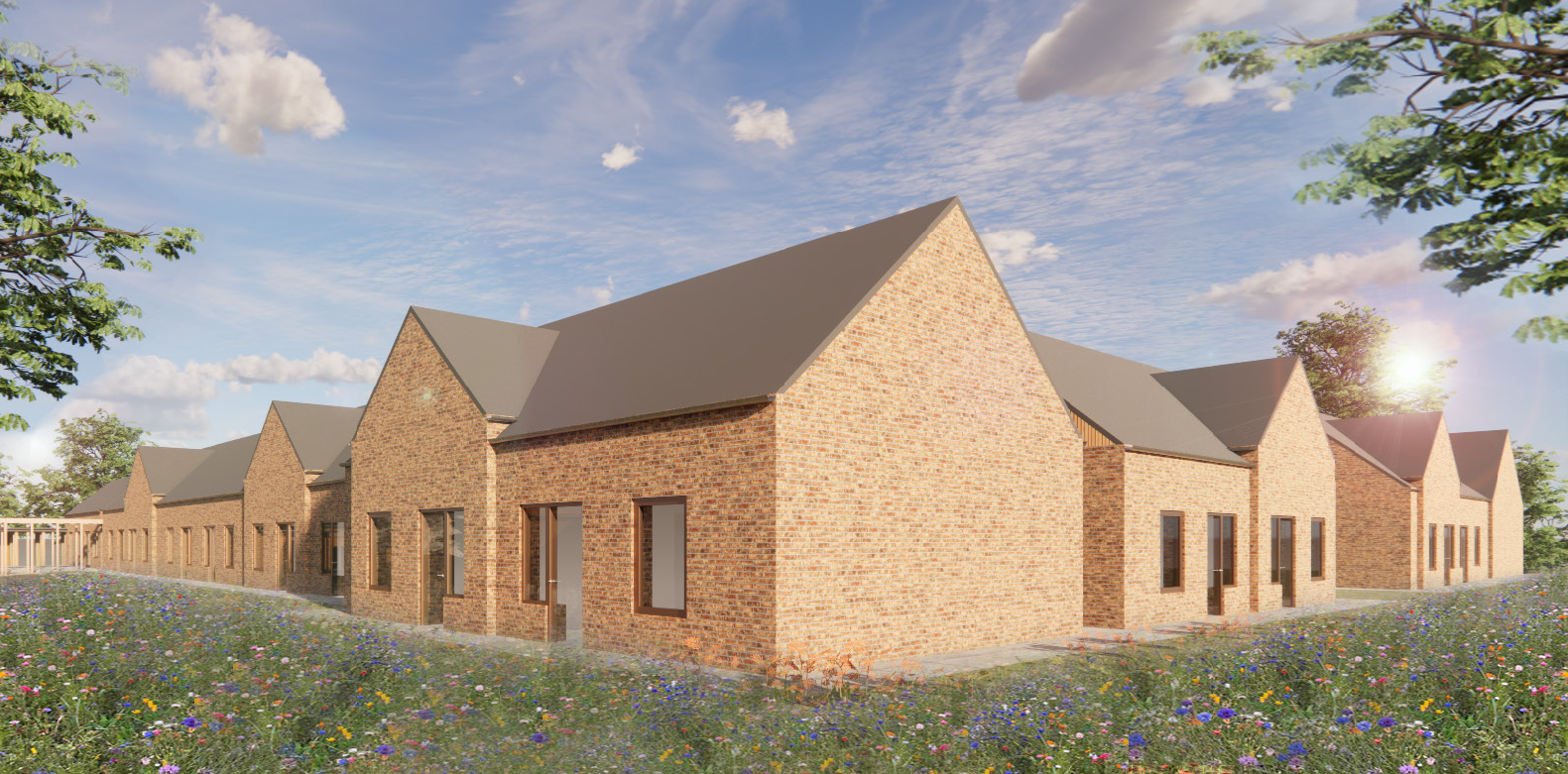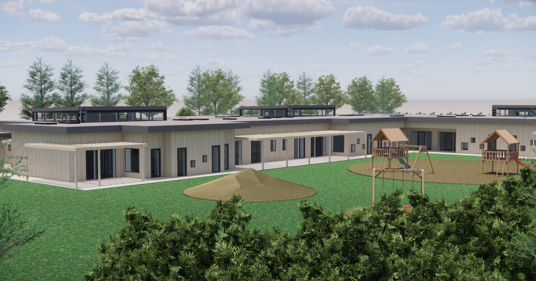 Her opfører vi ca. 450 m2 ny bebyggelse af 6 nye midlertidige boliger med tilhørende fælles boligarealer.
