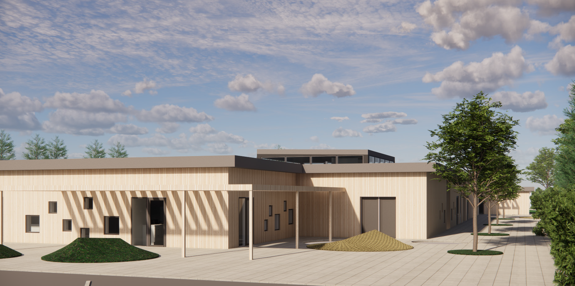 Facaderne er beklædt med thermomodificeret fyr med udvendige døre og vinduer i pulverlakeret aluminium, granitgrå farve. Indvendige karme i lakeret fyr vil markere sig i institutionens rumligheder og skabe en fin overgang mellem vægge og vinduespartier.