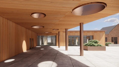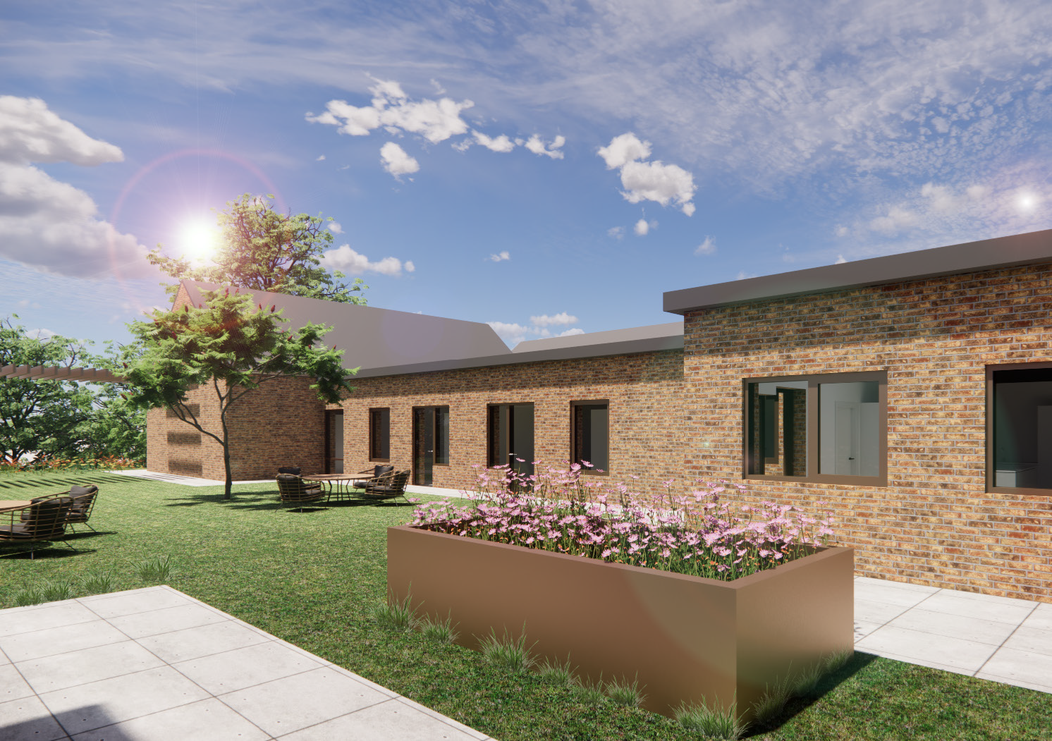Hovedindgangen til plejecentret markeres af en smuk pergola, der naturligt fører besøgende til plejecentrets ankomstområde.