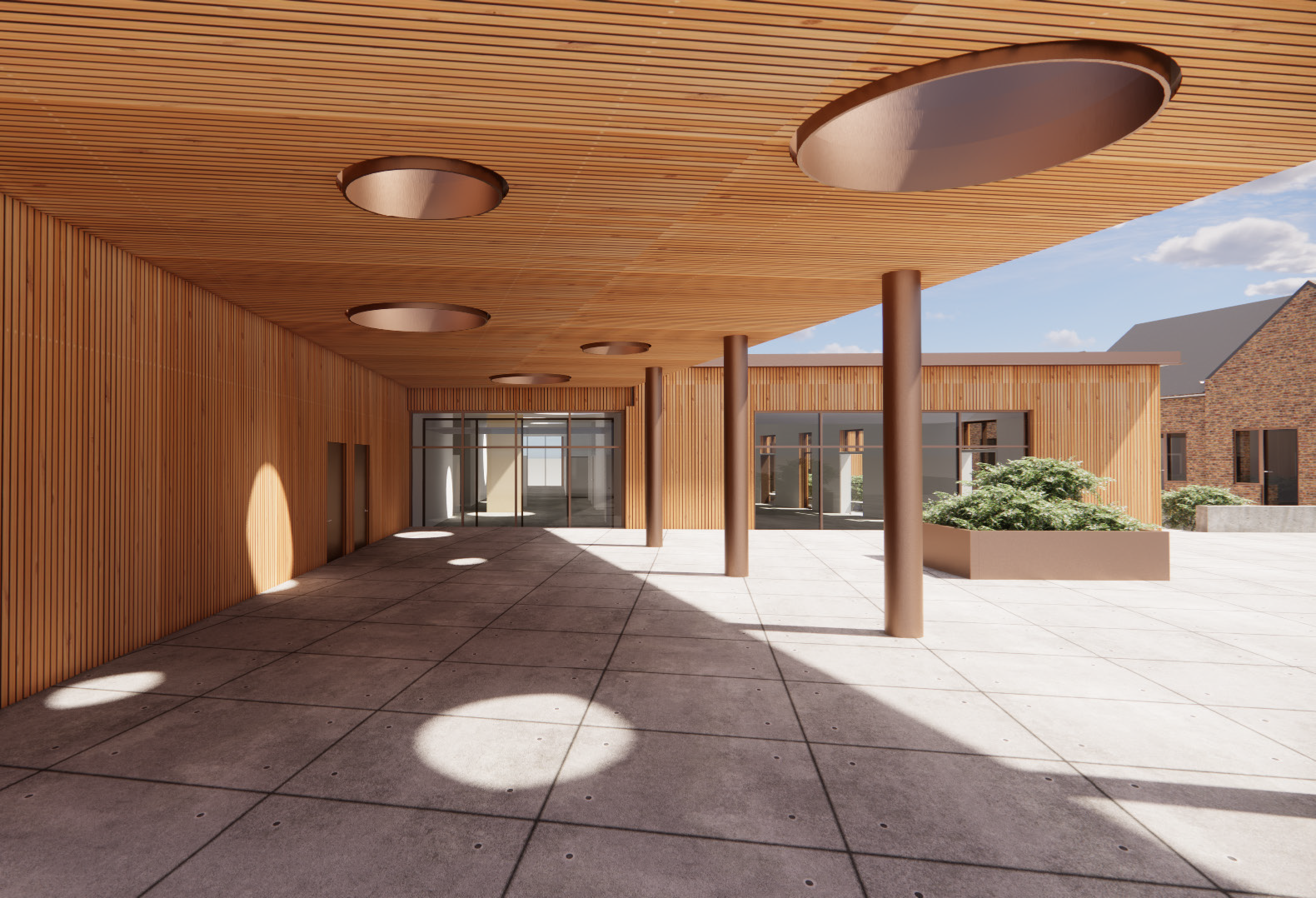 Gangforløbene mellem afdelingerne og servicebygningen udføres som en søjlekolonnade, der giver mulighed for at lukke eller åbne op mellem søjlerne med glas eller et lukket element som beklædes med en varmebehandlet fyr. Glaspartierne lukker dagslyset ind fra begge sider og lyser gangene op i dagstimerne. Samtidig skabes der nærhed til den omkringliggende natur.