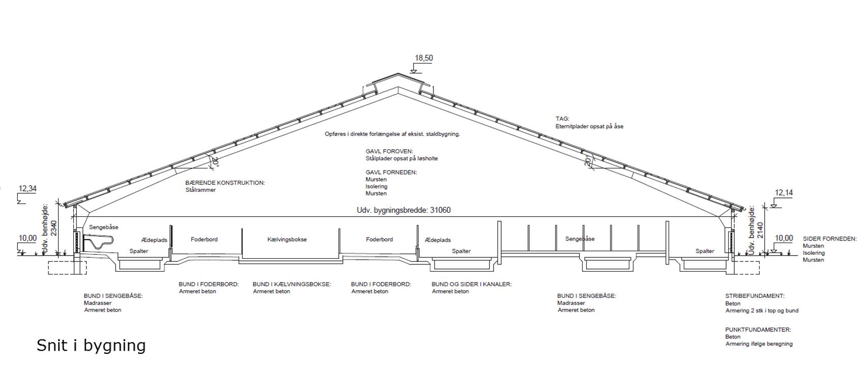 Snittegning skal vise et snit gennem konstruktionen. Tegningen skal vise materialevalg, højdemål, hældninger, fald, brandudluftning i tagkonstruktion m.v.