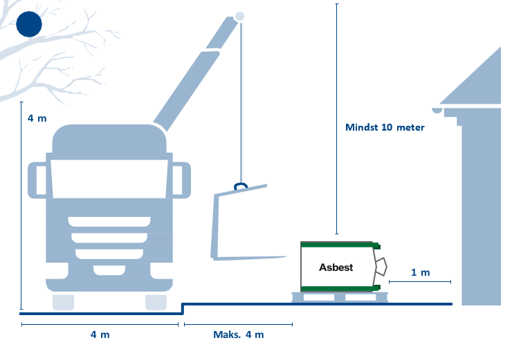 Placer asbestsækken på et plant underlag maks. 4 meter fra fast kørevej. Der skal være 1 meter frirum rundt om asbestsækken og mindst 10 meter i forhold til f.eks. træer og lygtepæle.