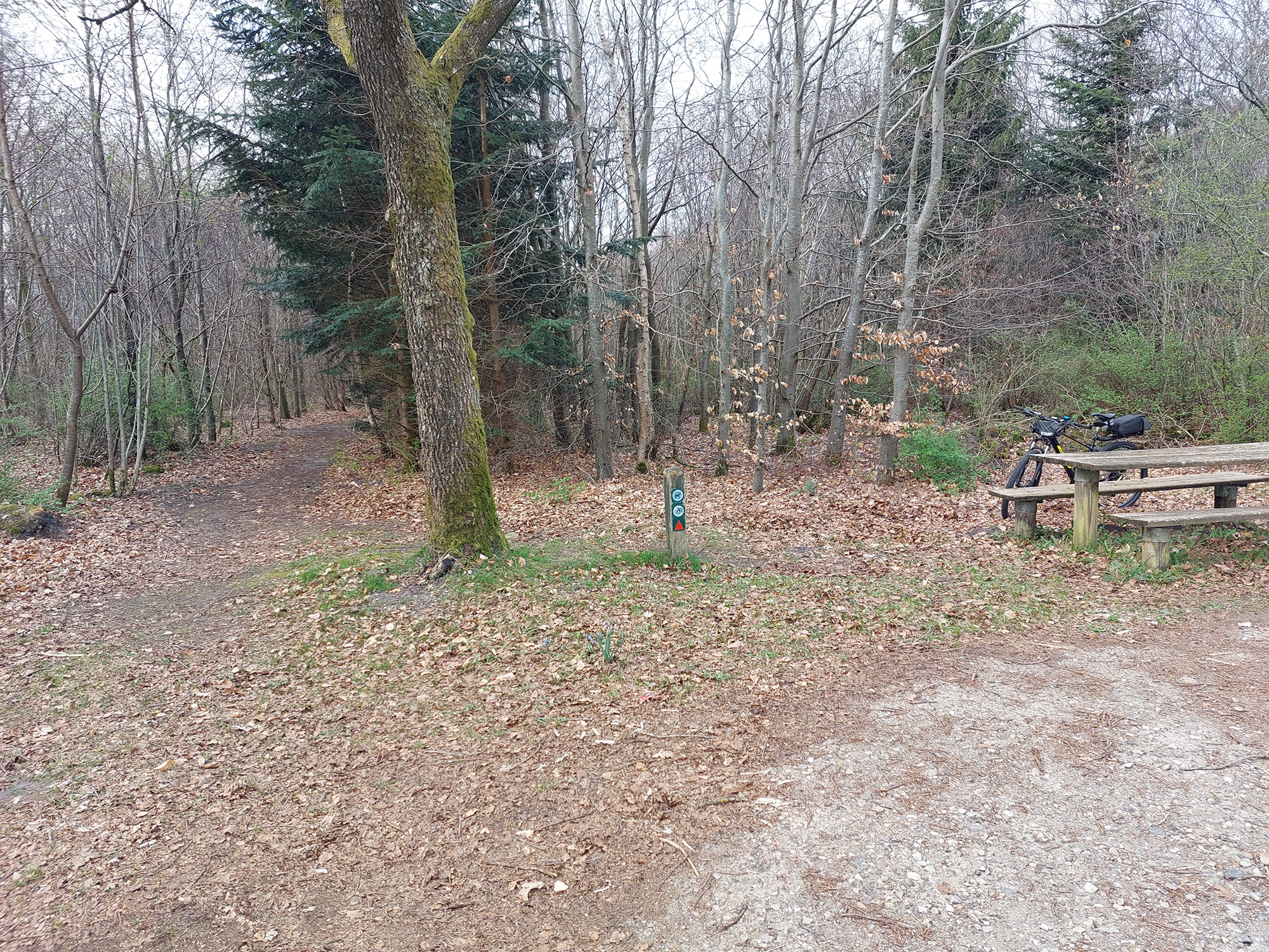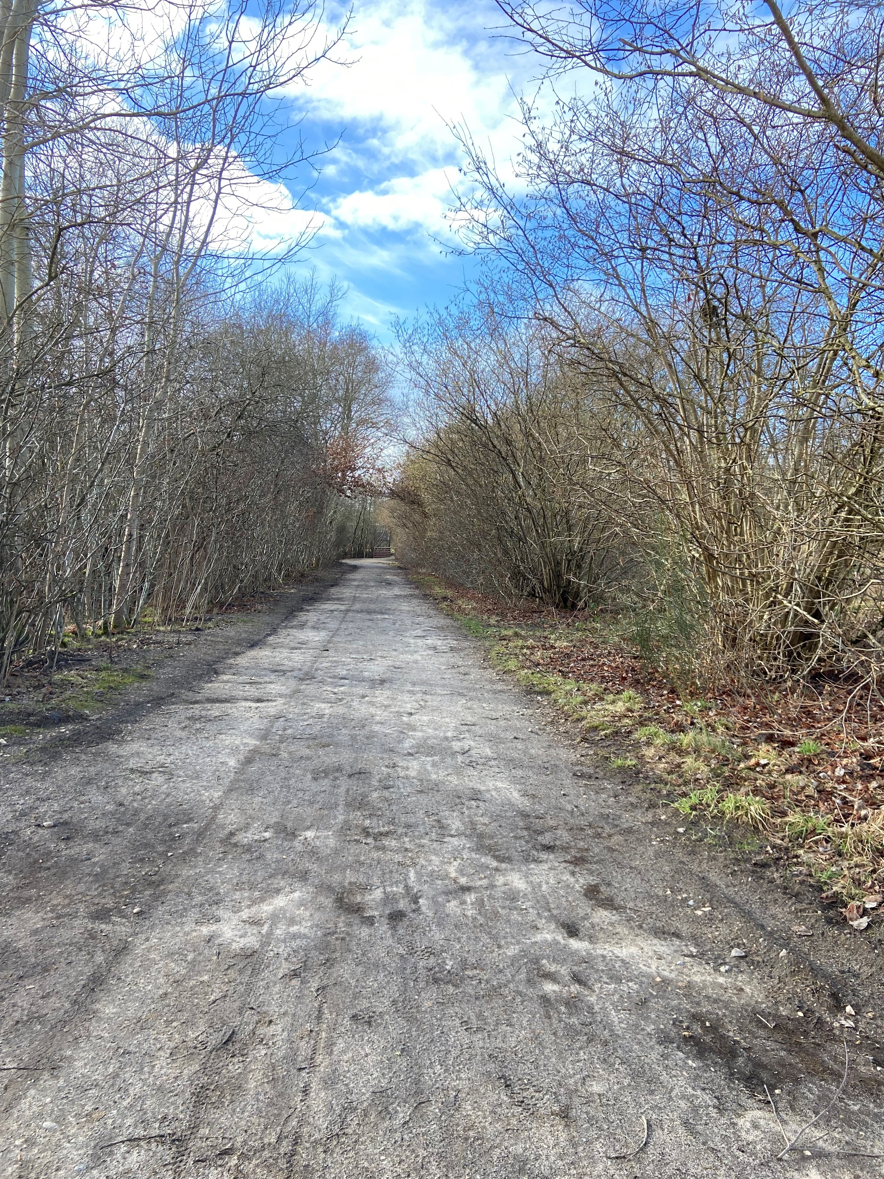 Gå videre ad sti gennem skov til I når til grusvej.