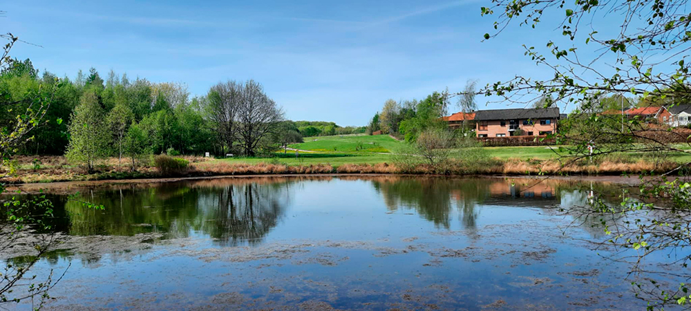 Følg trampestien rundt om søen hen til madpakkehuset. Fortsæt bagom madpakkehuset, ned til bækken, ad den nye bro over til sportspladsen.