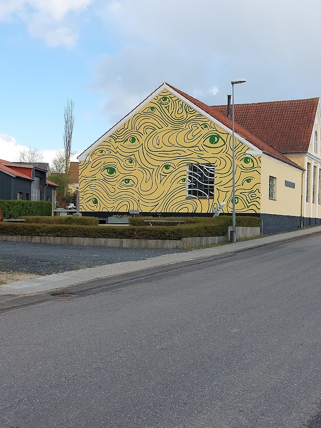 Gå ad Møltrupvej op igennem byen – bemærk bl.a. Gavlmaleriet (= Verdensmålsgavl nr. 13 – ”Klimaindsats”) på det Gamle Mejeri (Thors Design).