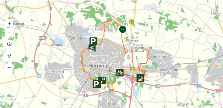 Det 28 km. lange spor leder dig gennem det varierede landskab omkring Herning, tæt på skov, søer, byen og seværdigheder.