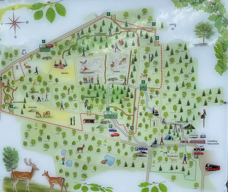 Der er gode parkeringsforhold ved Løvbakkerne. Både hvis du parkerer ved Naturcentret eller ved dyrehaven.