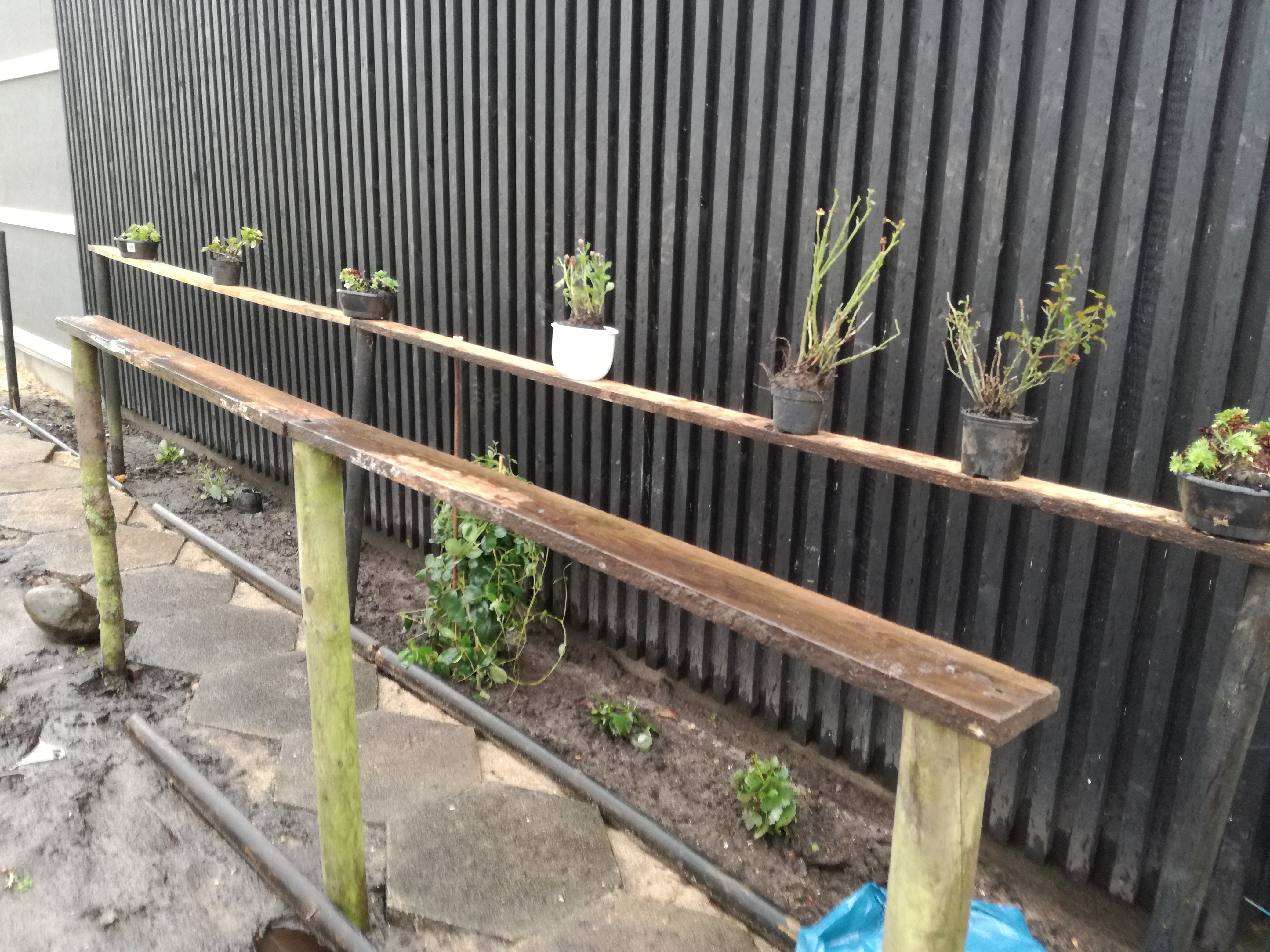 Havearbejde, f.eks. trillebør, vandkande, kost, rive, hakke, grønne planter, potter