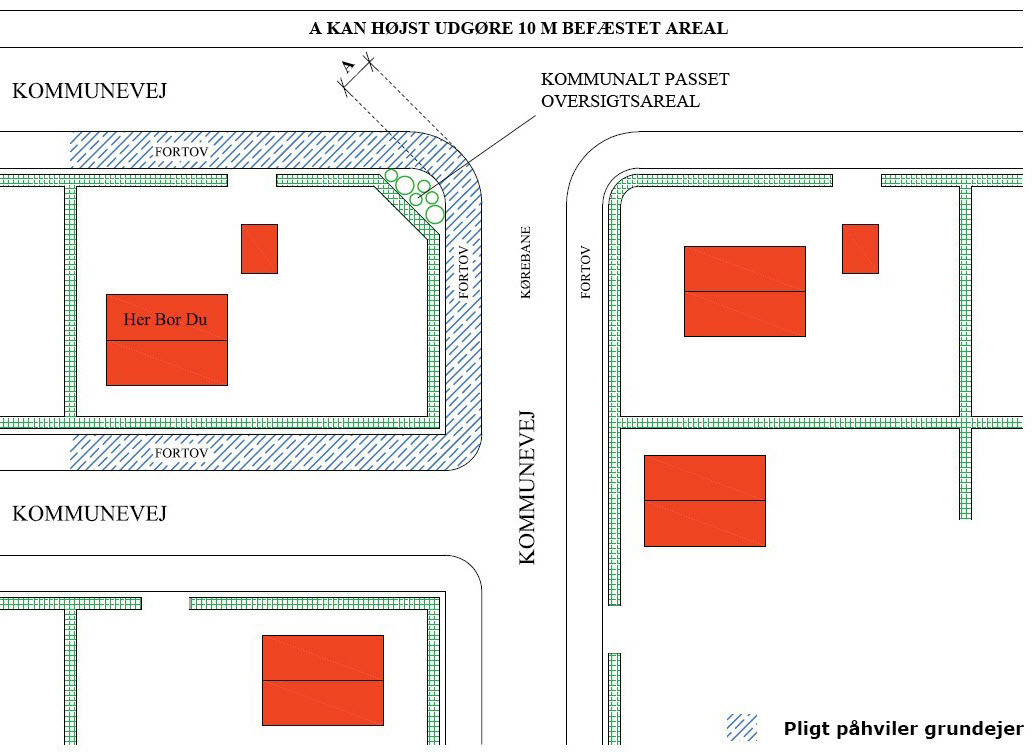 Hjørnegrund grænsende til 3 kommuneveje med fortove.