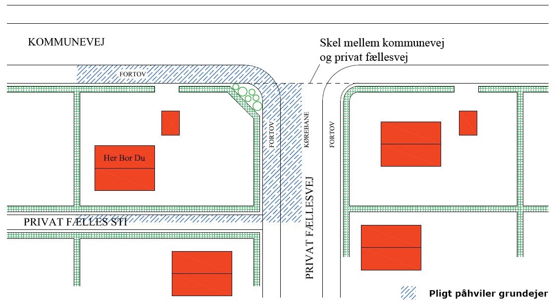 Pligten kan i dette tilfælde pålægges grundejeren for det kommunale fortov. Tilsvarende kan pligten pålægges for den private fællesvej og den private fællessti for den del af vejen og stien, der ligger nærmest ejendommen.