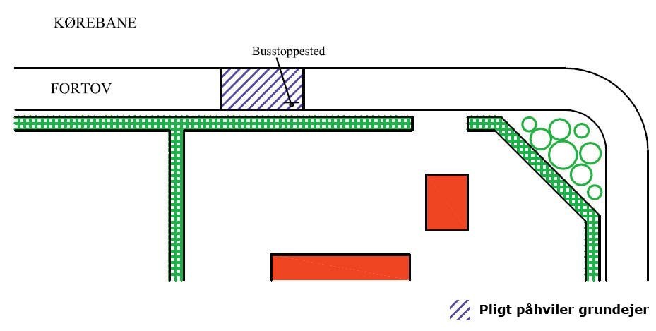 Busperron på eller i forbindelse med fortov. Grundejeren kan pålægges busperronen, da busperronen ligger i ubrudt forlængelse af fortovet, der igen ligger i ubrudt forlængelse af adgangen til ejendommen.