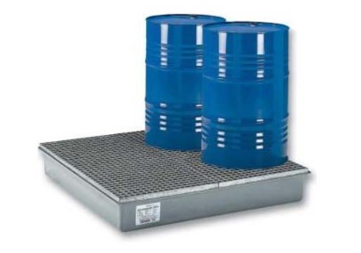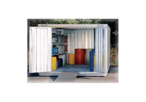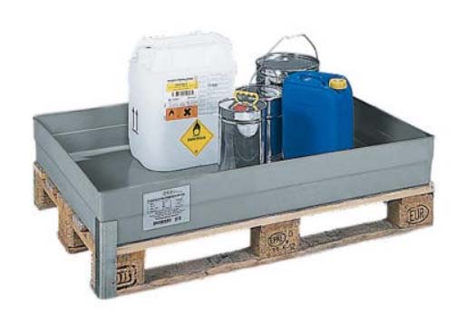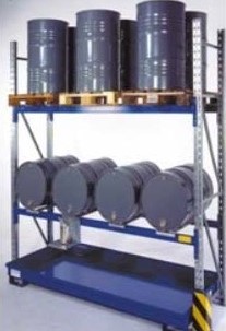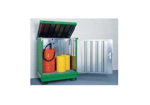 Mindre oplag i tromler og dunke kan opbevares i specielle containere med spildbakke. Oplaget bør kunne aflåses, således at uvedkommende ikke kan forårsage forurening (se nedenstående eksempel):